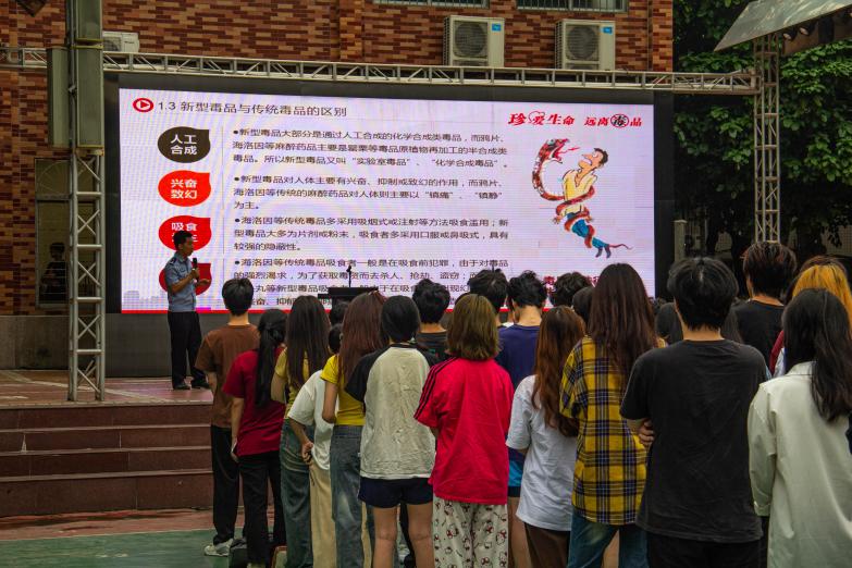 5月13日,艺术与教育学院在荔湾校区篮球场举行了一场禁毒主题宣讲活动。宣讲活动在庄严的升旗仪式后举行,活动邀请了荔湾区公安分局禁毒大队队长许木池警官为同学们讲解了新型毒品的危害及预防知识。