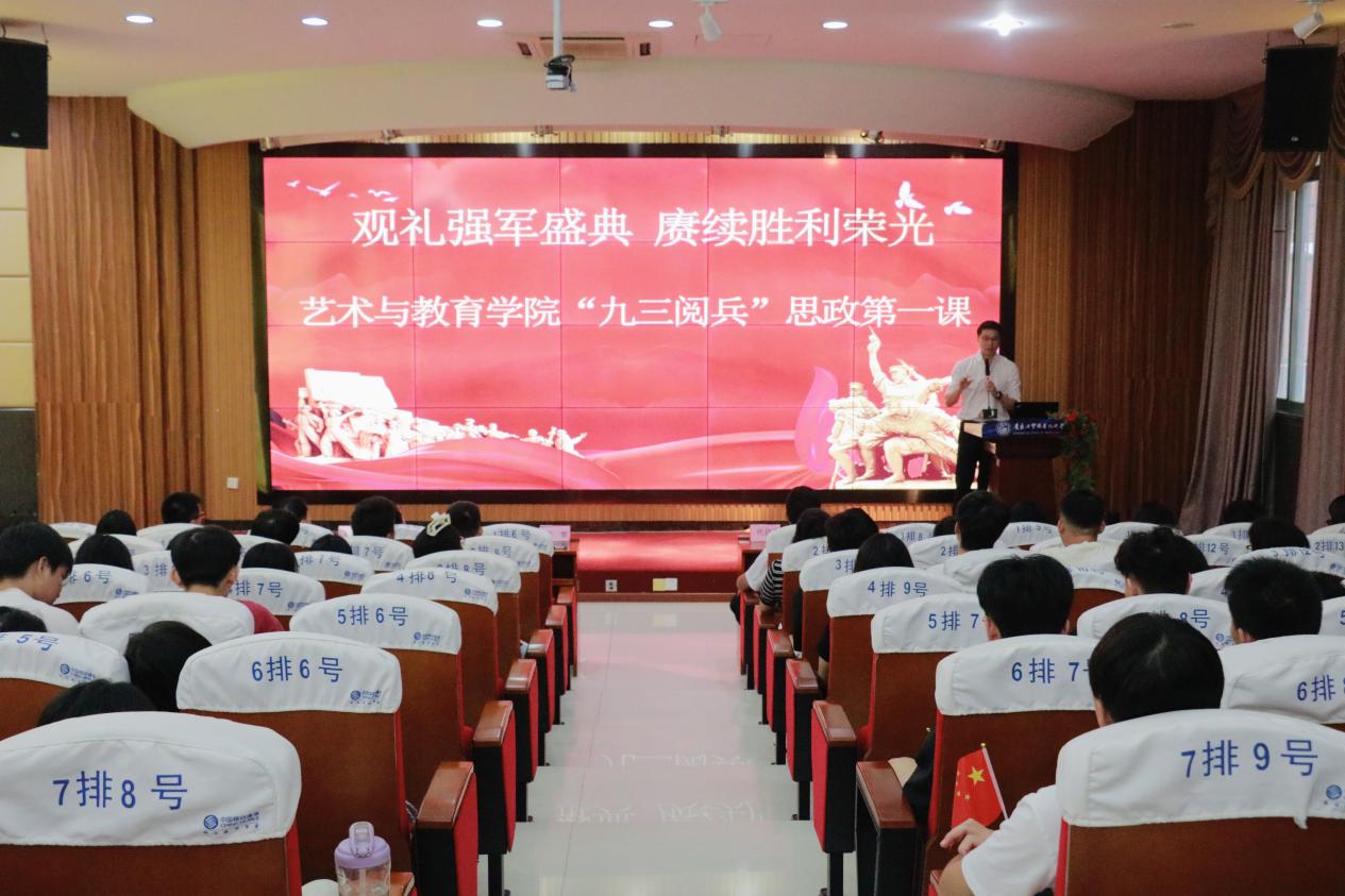 9月3日上午,艺术与教育学院的报告厅里掌声雷动——一场以"阅兵+思政"为特色的"红色第一课"正在上演。学院党总支书记李繁以中国人民抗日战争暨世界反法西斯战争胜利80周年纪念活动为生动教材,带领师生在钢铁洪流与历史回响中,上了一堂浸润心灵的爱国教育课。