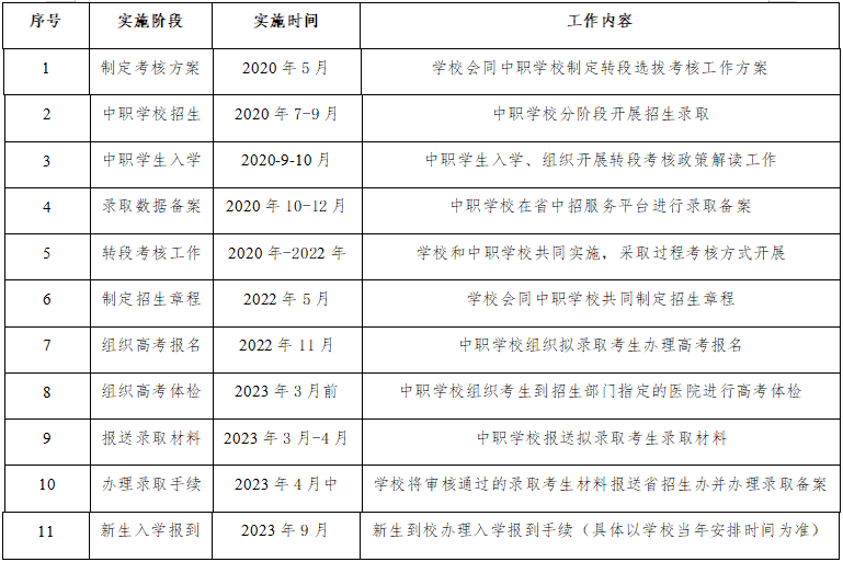 (一)考核课程与分值:转段考核由我校牵头对口中职学校,采取过程考核方式开展。转段考核课程由中职学段2门文化基础课和3门专业课组成,每门课程各100分,考核满分为500分,并最终将每门课程成绩按20%的比例折算转段考核成绩,转段考核成绩总分共100分,拟录取的考生转段考核总成绩原则上不低于40分。