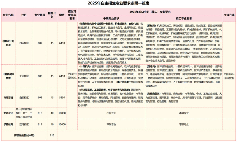 1 | 普通高职自主招生招收中职生 (校本部) | 模具设计与制造、 计算机网络技术 市场营销、艺术设计、 学前教育 | “文化基础”(闭卷笔试考核)+“职业技能”(机试、实操、面试或闭卷笔试考核) | 2025年5月17日 (具体考试安排以准考证为准) |