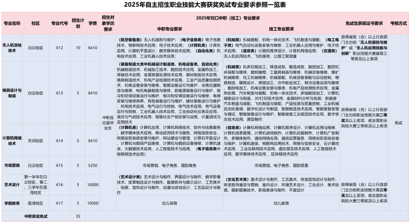 2. 根据国家和省有关文件精神,模具设计与制造、计算机网络技术和市场营销专业免试条件为获得与报考专业相关的广东省中等职业学校技能大赛二等奖或全国职业院校大赛三等奖及以上奖项;艺术设计和学前教育专业免试条件为获得与报考专业相关的广东省中等职业学校技能大赛三等奖或全国职业院校大赛三等奖及以上奖项;无人机测绘技术专业免试条件为获得省级(含)以上行政部门主办的“无人机操控与维护”或“无人机应用技能与创新”职业技能大赛省级三等奖及以上奖项。