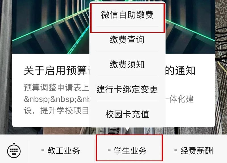 2.进入公众号,点击“学生业务”→“微信自助缴费”;
